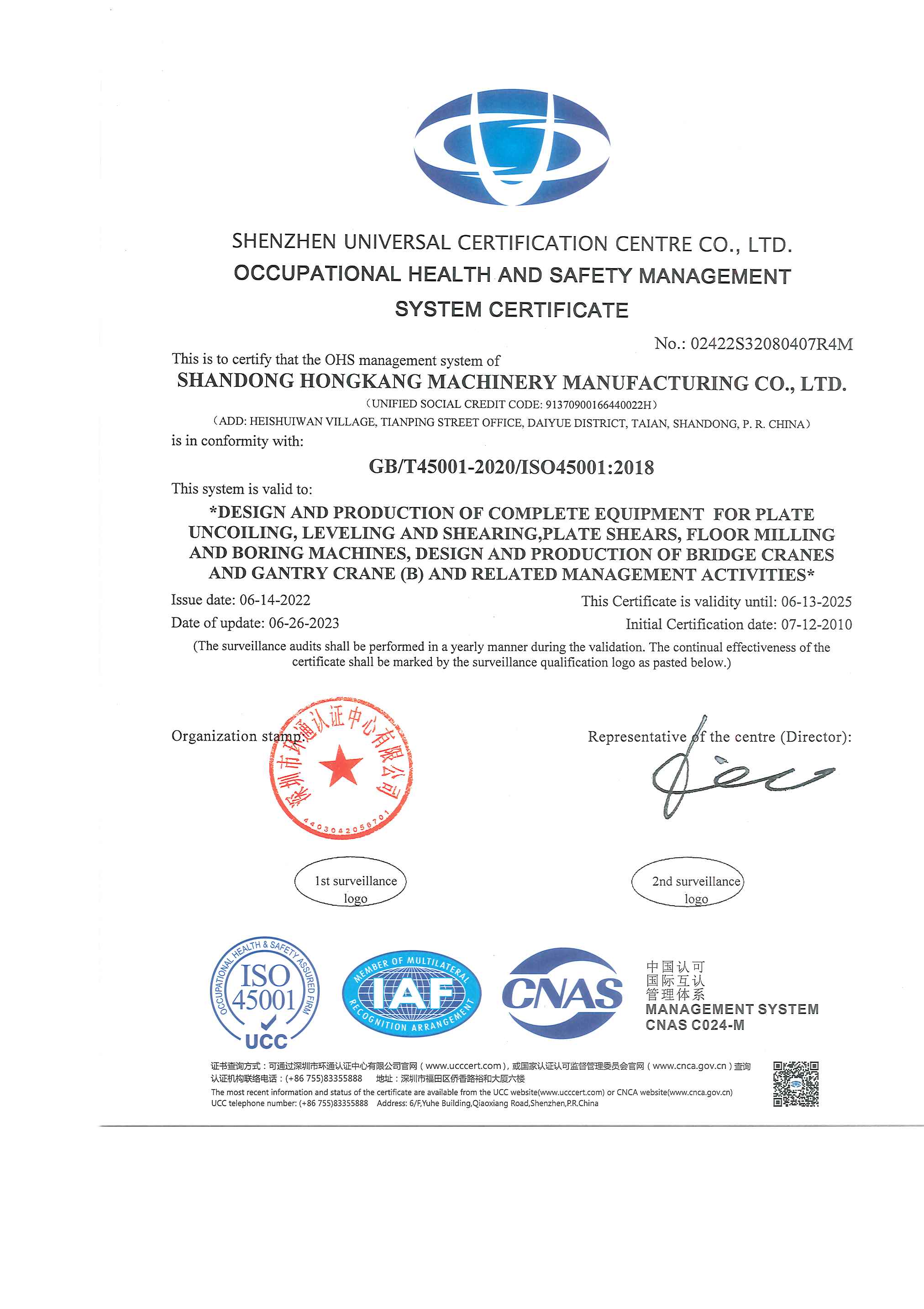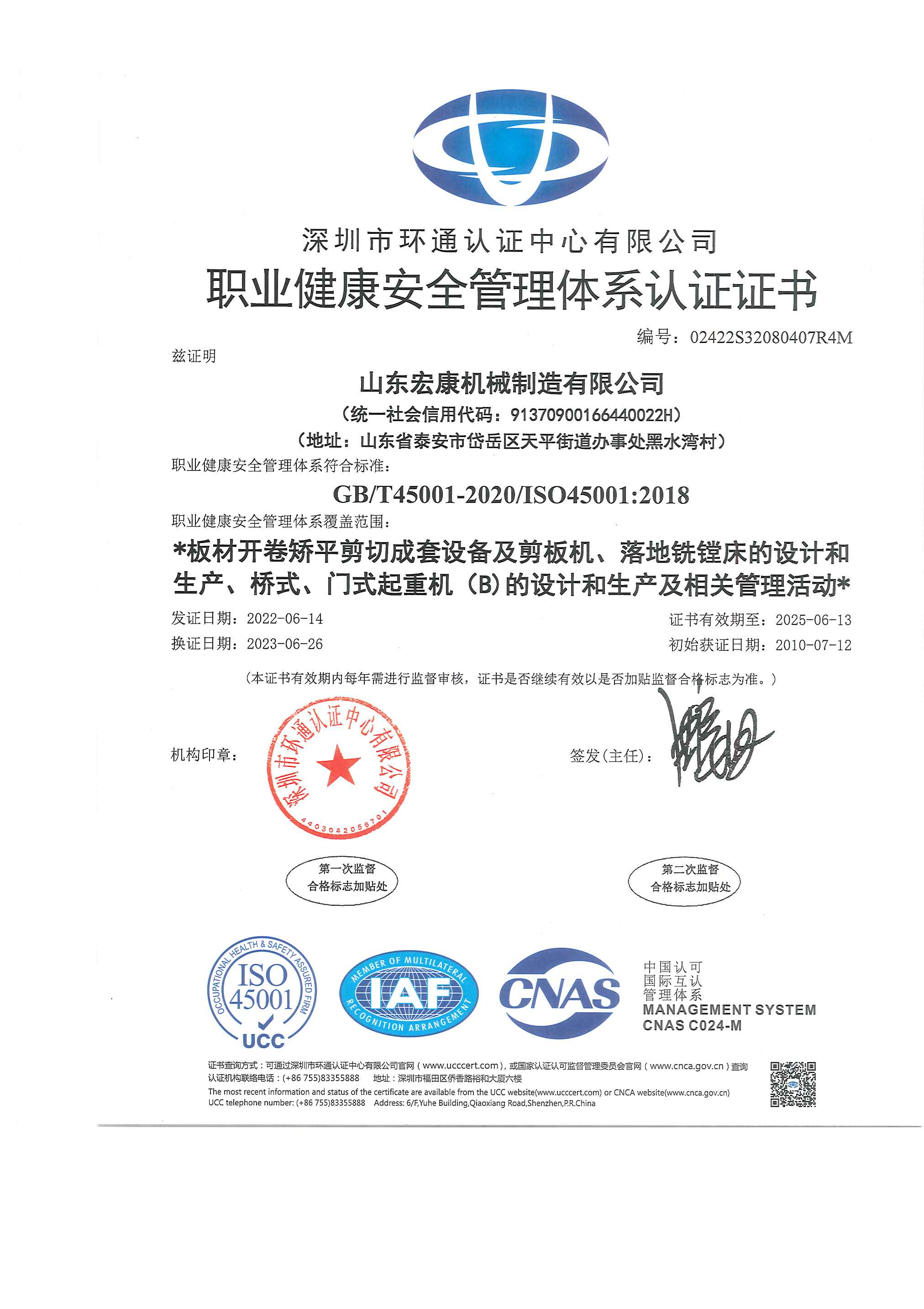 職業健康安全管理體系認證證書